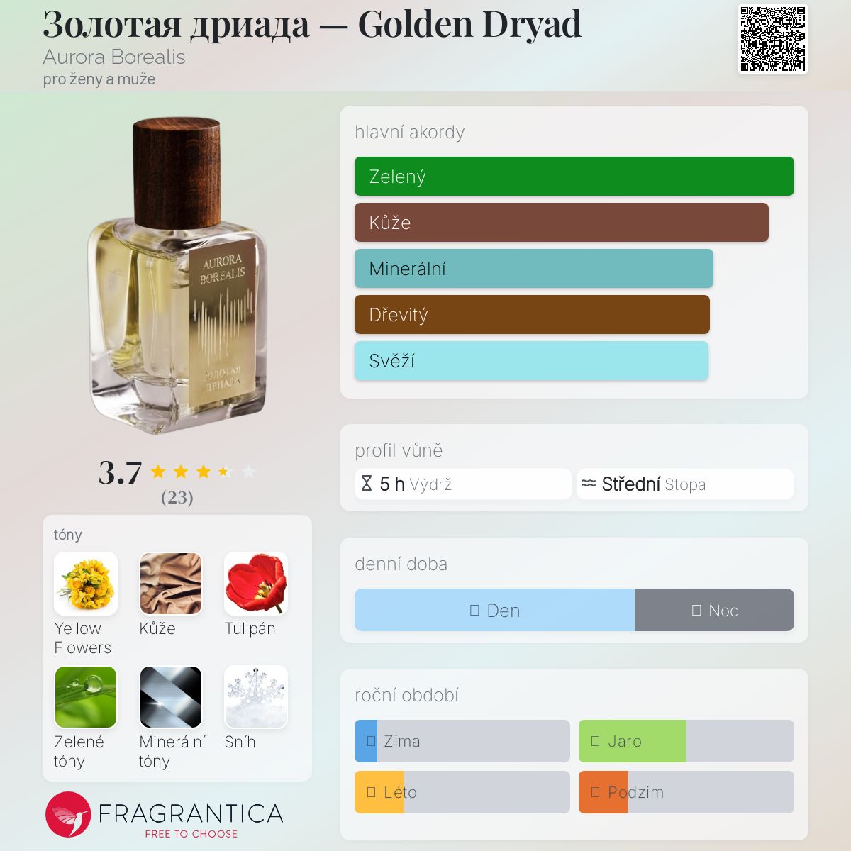 Золотая дриада — Golden Dryad podle Aurora Borealis je Woody Aquatic vůně pro ženy a muže. Золотая дриада — Golden Dryad byl/a uveden/a v roce 2023. "Nosem" za touto vůní je Olga Korotkova. Vrchní tóny jsou Tulipán, Minerální tóny, Sníh a Meloun; střední tóny jsouŽluté květy, Kůže a Bylinné tóny ; základní tóny jsou Dřevité tóny, Mech a Jantar (ambra).