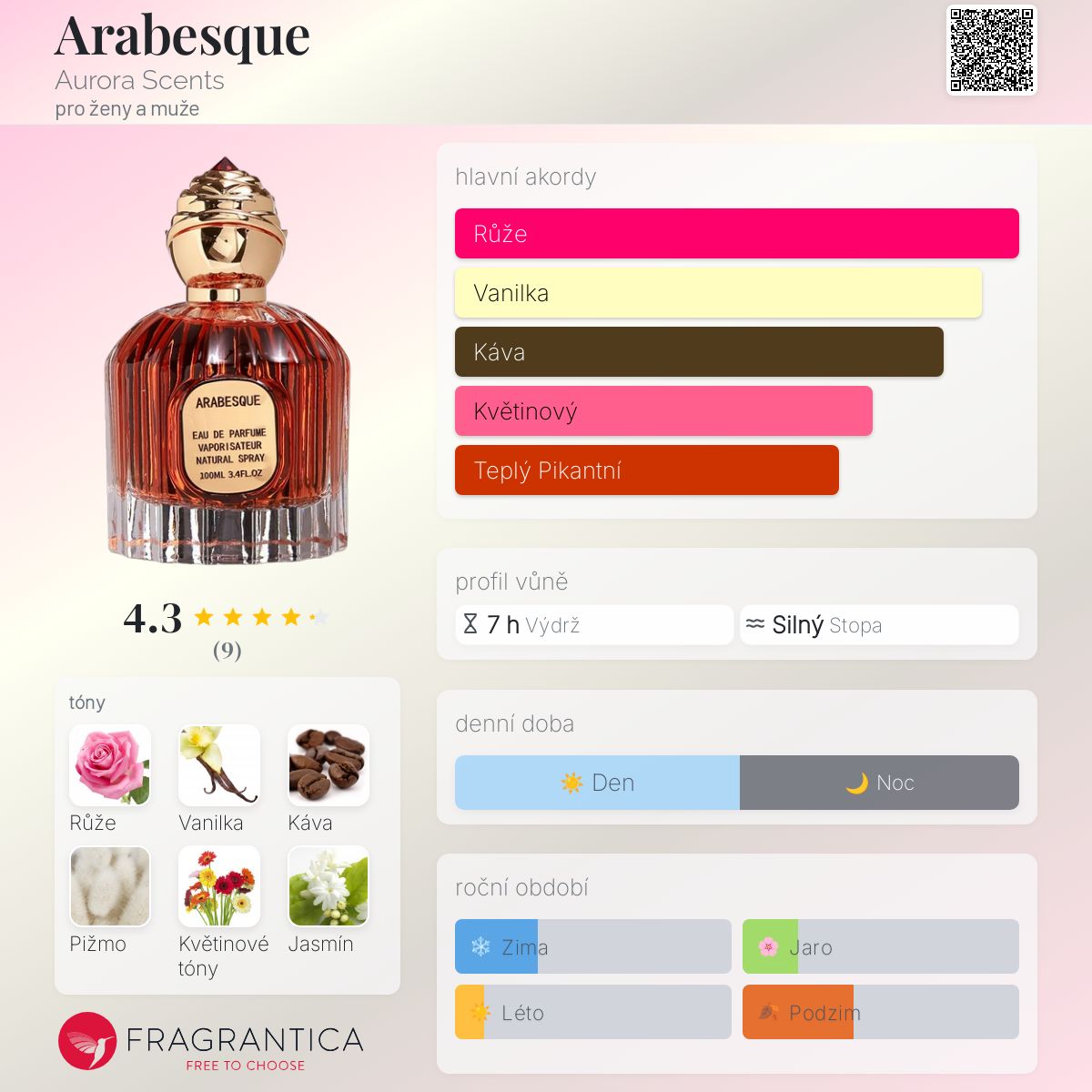 Arabesque podle Aurora Scents je Floral vůně pro ženy a muže. Arabesque byl/a uveden/a v roce 2022. Vrchní tóny jsou Růže a Bergamot; střední tóny jsouKáva, Květinové tóny a Jasmín ; základní tóny jsou Vanilka a Pižmo.