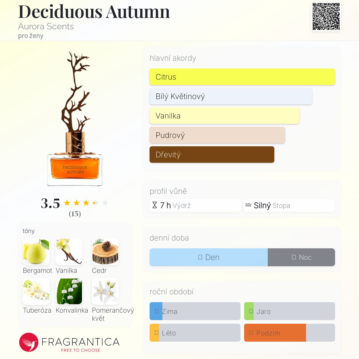 Deciduous Autumn podle Aurora Scents je Orientální Floral vůně pro ženy. Deciduous Autumn byl/a uveden/a v roce 2022. Vrchní tóny jsou Bergamot, Tuberóza a Černý rybíz; střední tóny jsouKonvalinka, Pomerančový květ, Ylang-Ylang, Broskev, Jablko a Maliny ; základní tóny jsou Vanilka, Cedr, Jantar (ambra), Opoponax, Myrha, Pačuli a Kokos.