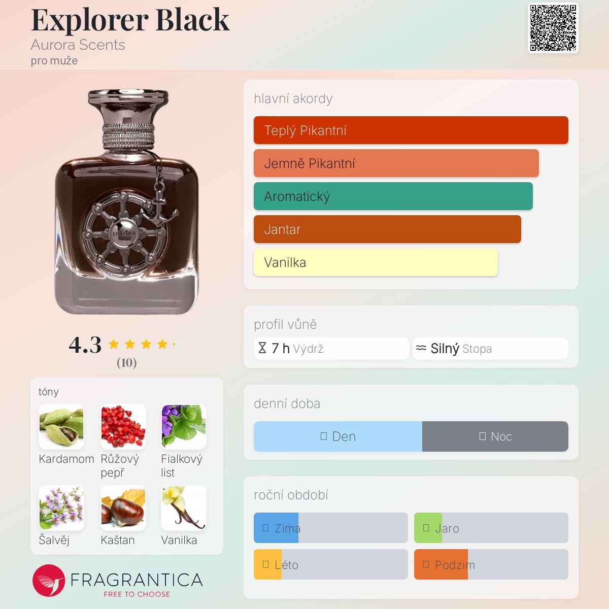 Explorer Black podle Aurora Scents je Orientální Woody vůně pro muže. Explorer Black byl/a uveden/a v roce 2020. Explorer Black byl/a vytvořen/a Lorenzo De Mosici a M.H Gerashi. Vrchní tóny jsou Kardamom, Růžový pepř a Fialkový list; střední tón jeŠalvěj ; základní tóny jsou Kaštan, Vanilka a Jantarové dřevo.