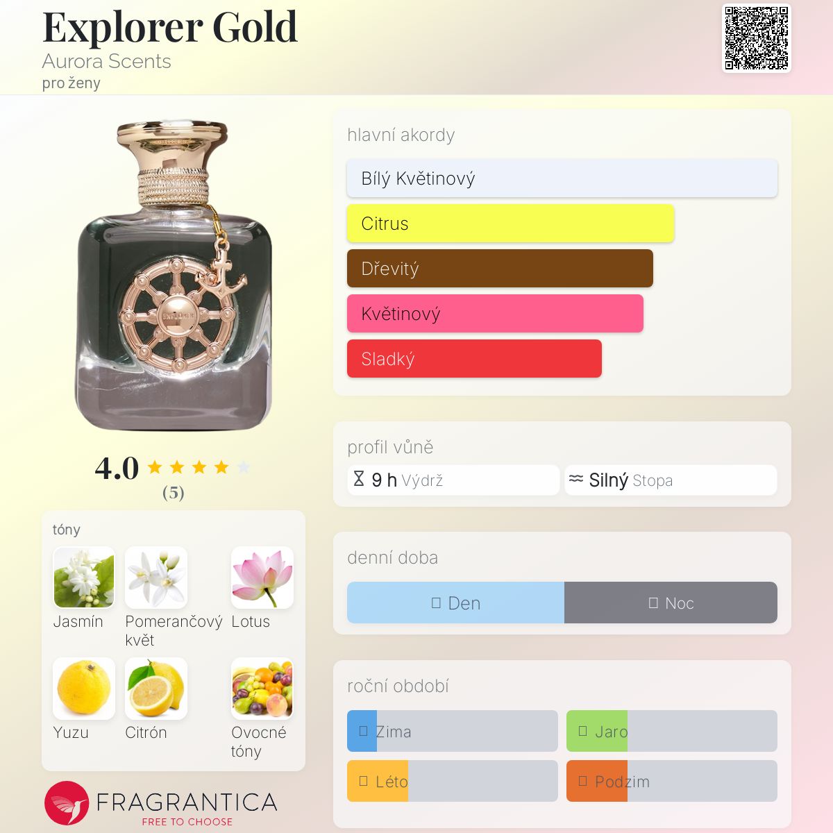 Explorer Gold podle Aurora Scents je Floral vůně pro ženy. Explorer Gold byl/a uveden/a v roce 2020. Explorer Gold byl/a vytvořen/a Lorenzo De Mosici a M.H Gerashi. Vrchní tóny jsou Yuzu, Citrón, Ovocné tóny a Vodnaté tóny; střední tóny jsouJasmín, Pomerančový květ a Lotus ; základní tóny jsou Cedr, Pačuli, Santalové dřevo a Vanilka.