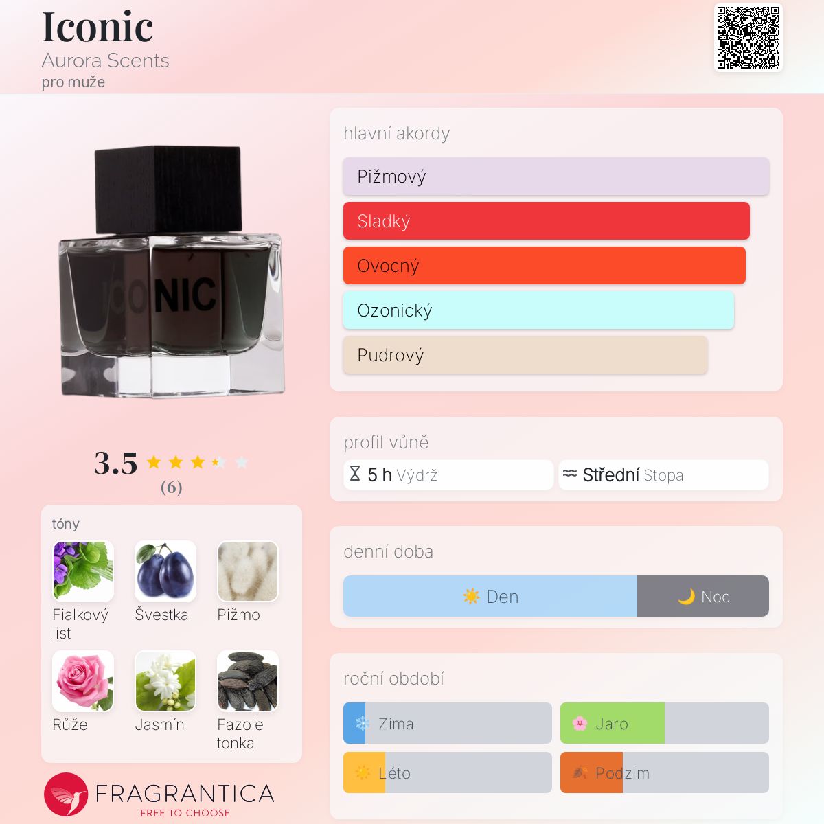 Iconic podle Aurora Scents je vůně pro muže. Iconic byl/a uveden/a v roce 2022. "Nosem" za touto vůní je Arturetto Landi. Vrchní tóny jsou Fialkové listy, Švestka, Růžový pepř, Bergamot a Citrón; střední tóny jsouRůže, Jasmín, Karafiát a Kosatec ; základní tóny jsou Bílé pižmo, Fazole tonka, Vanilka a Mech.