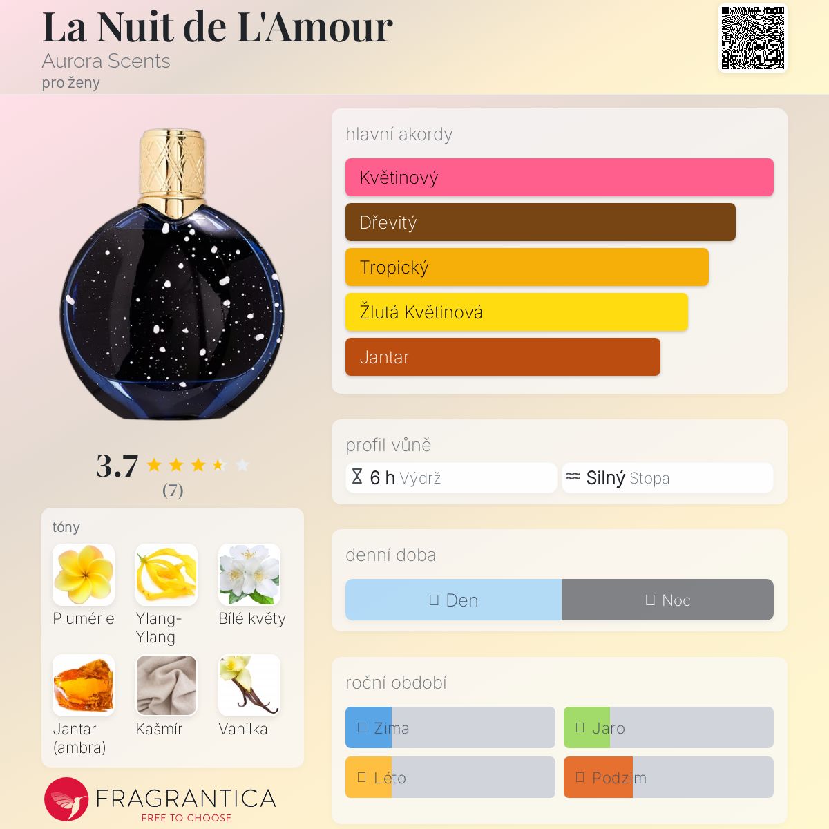 La Nuit de L'Amour podle Aurora Scents je Floral vůně pro ženy. La Nuit de L'Amour byl/a uveden/a v roce 2022. Vrchní tóny jsou Plumérie, Ylang-Ylang a Bílé květy; střední tóny jsouJantar (ambra) a Pižmo ; základní tóny jsou Kašmír, Vanilka a Cedr.