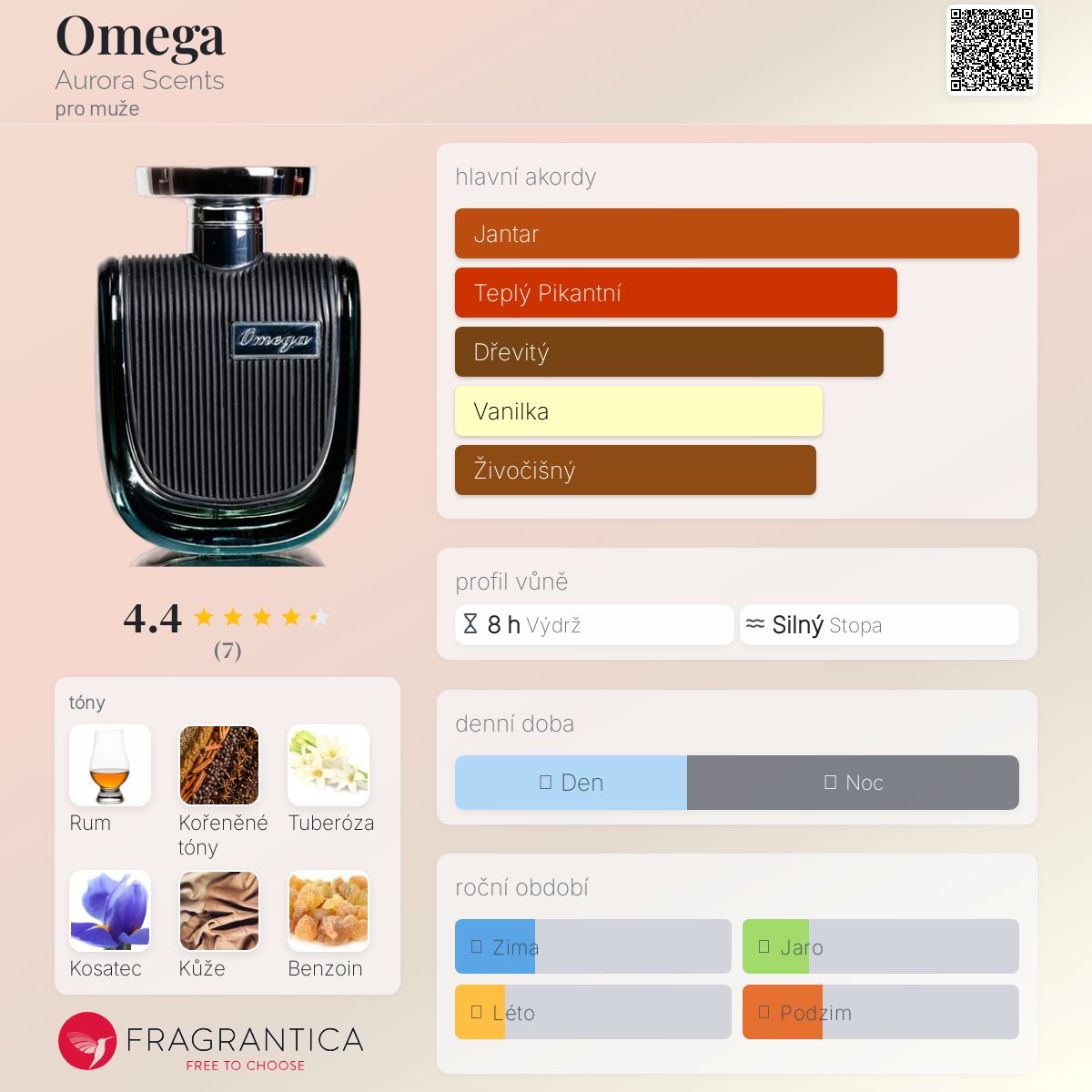 Omega podle Aurora Scents je Orientální Woody vůně pro muže. Omega byl/a uveden/a v roce 2018. Omega byl/a vytvořen/a Lorenzo De Mosici a M.H Gerashi. Vrchní tóny jsou Rum a Koření; střední tóny jsouTuberóza, Kosatec a Kůže ; základní tóny jsou Benzoin, Fazole tonka, Guajakové dřevo a Jantar (ambra).