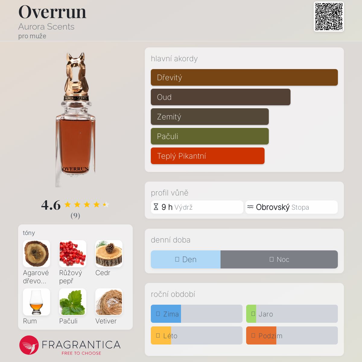 Overrun podle Aurora Scents je Leather vůně pro muže. Toto je nová vůně. Overrun byl/a uveden/a v roce 2024. Vrchní tóny jsou Růžový pepř a Pepř; střední tóny jsouAgarové dřevo (oud), Cedr, Rum a Kůže ; základní tóny jsou Pačuli a Vetiver.