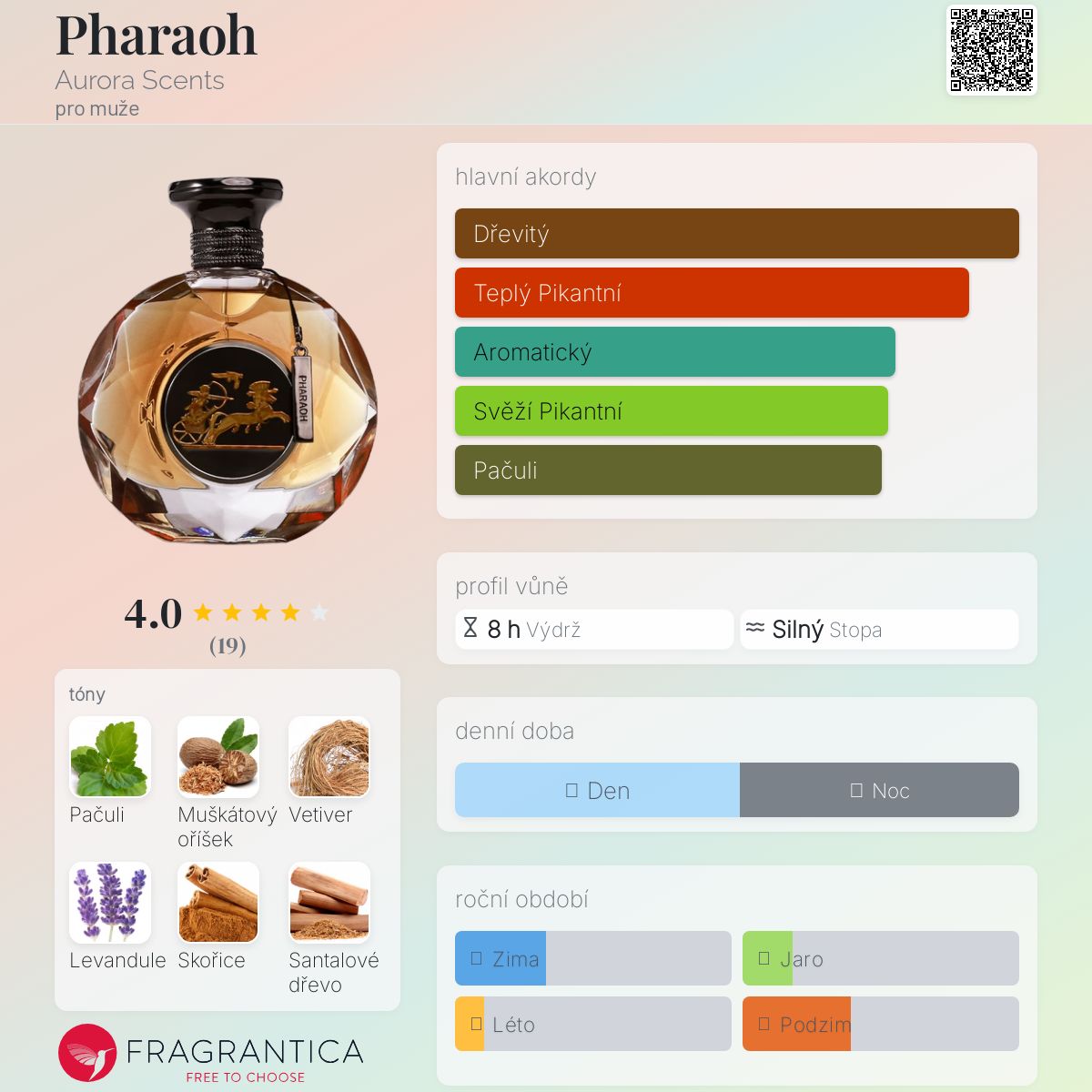 Pharaoh podle Aurora Scents je Orientální Woody vůně pro muže. Pharaoh byl/a uveden/a v roce 2022. "Nosem" za touto vůní je M.H Gerashi. Vrchní tóny jsou Muškátový oříšek, Skořice a Kardamom; střední tón jeLevandule ; základní tóny jsou Pačuli, Haitský vetiver, Santalové dřevo a Jantar (ambra).