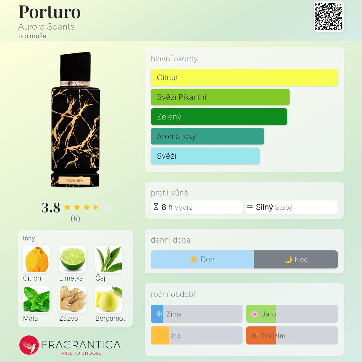 Porturo podle Aurora Scents je Aromatic vůně pro muže. Porturo byl/a uveden/a v roce 2022. Vrchní tóny jsou Citrón, Limetka, Máta a Bergamot; střední tóny jsouZázvor, Petitgrain, Pelargónie, Jalovcové bobulky a Galbanum ; základní tóny jsou Černý čaj, Ambra, Elimi, Pižmo a Vetiver.