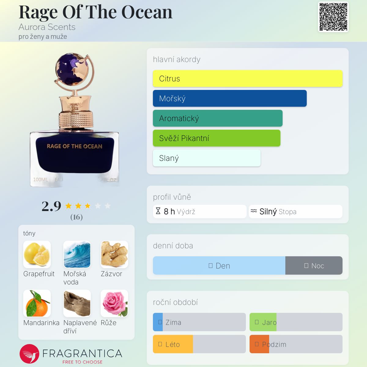 Rage Of The Ocean podle Aurora Scents je Aromatic Aquatic vůně pro ženy a muže. Rage Of The Ocean byl/a uveden/a v roce 2022. "Nosem" za touto vůní je M.H Gerashi. Vrchní tóny jsou Grapefruit, Zázvor, Mandarinka a Kadidlo; střední tóny jsouMořské tóny, Růže a Cedr ; základní tóny jsou Naplavené dříví, Ambra a Jantar (ambra).