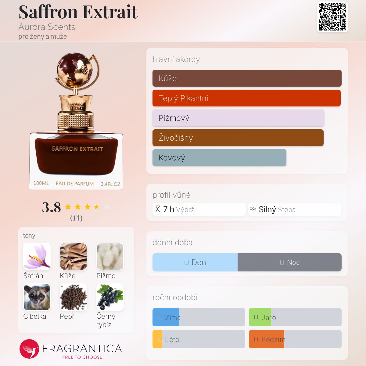 Saffron Extrait podle Aurora Scents je Aromatic Spicy vůně pro ženy a muže. Saffron Extrait byl/a uveden/a v roce 2022. "Nosem" za touto vůní je M.H Gerashi. Vrchní tóny jsou Pepř, Koriandr, Bergamot a Citrón; střední tóny jsouŠafrán, Černý rybíz, Bílé květy a Pomerančový květ ; základní tóny jsou Kůže, Pižmo, Cibetka, Jantar (ambra) a Dřevité tóny.