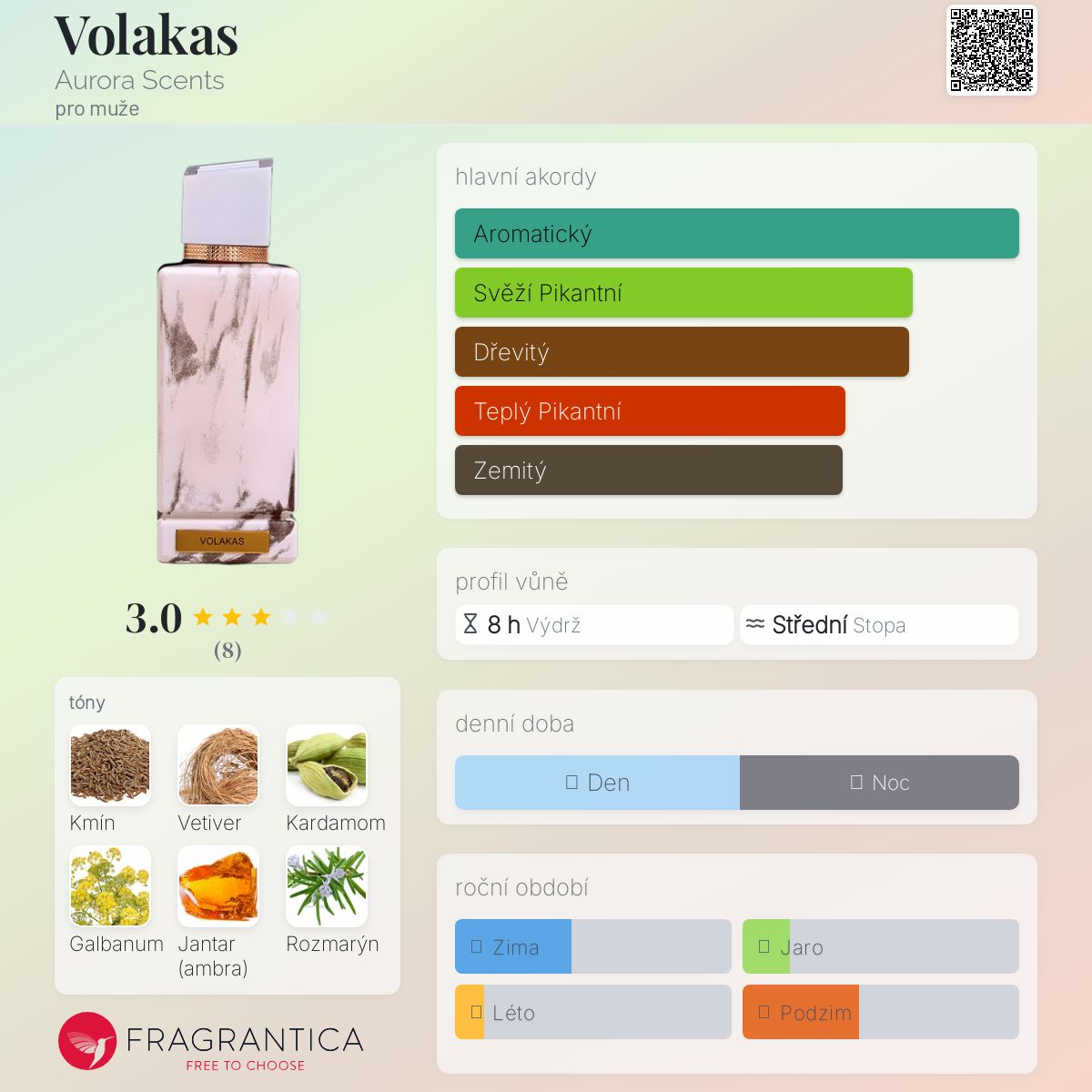 Volakas podle Aurora Scents je Leather vůně pro muže. Volakas byl/a uveden/a v roce 2022. Vrchní tóny jsou Galbanum, Rozmarýn, Tymián a Fialkový list; střední tóny jsouKmín, Kardamom, Pačuli, Kosatec, Růžový pepř, Muškátový oříšek a Pelargónie ; základní tóny jsou Vetiver, Jantar (ambra), Pačuli, Kůže, Cedr, Dubový mech a Kadidlo.