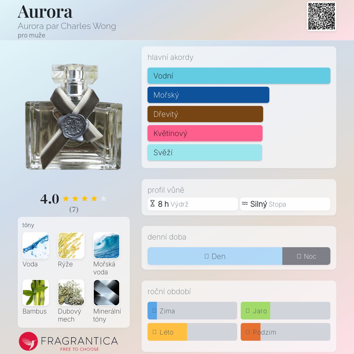 Aurora podle Aurora par Charles Wong je Woody Aquatic vůně pro muže. Aurora byl/a uveden/a v roce 2018. "Nosem" za touto vůní je Richard Asfour. Vrchní tóny jsou Vodní tóny, Fíkový list, Bergamot a Černý rybíz; střední tóny jsouRýže, Bambus, Lotus a Dešťové tóny ; základní tóny jsou Mořská voda, Dubový mech, Minerální tóny, Frézie a Jantar (ambra).