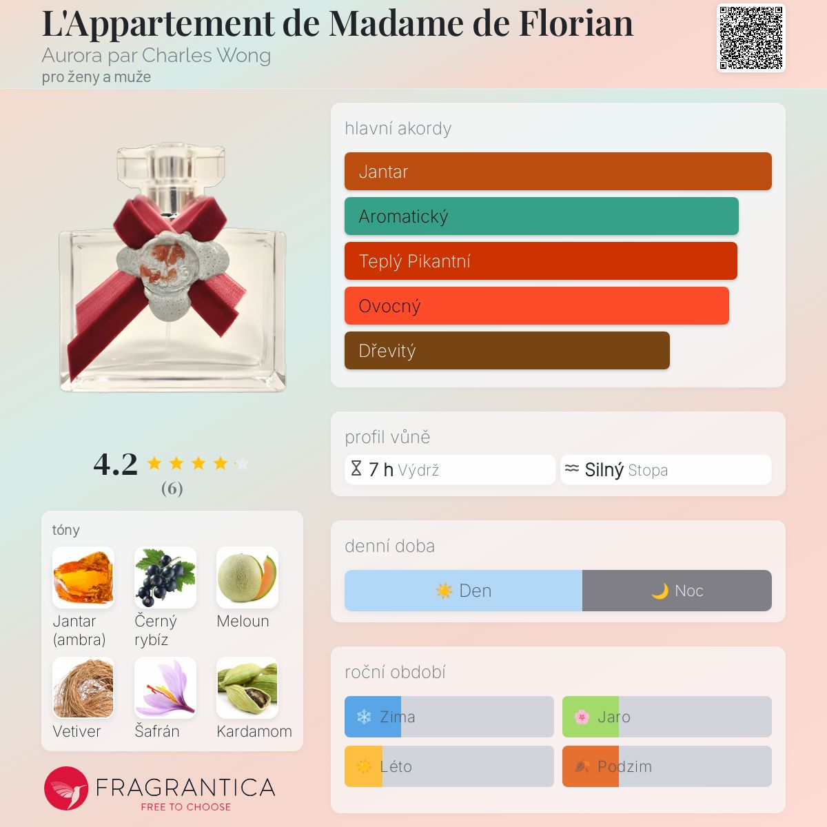 L'Appartement de Madame de Florian podle Aurora par Charles Wong je Orientální Spicy vůně pro ženy a muže. L'Appartement de Madame de Florian byl/a uveden/a v roce 2022. "Nosem" za touto vůní je Richard Asfour. Vrchní tóny jsou Vavříny, Bergamot a Absint; střední tóny jsouČerný rybíz, Meloun, Šafrán, Kardamom a Pepř ; základní tóny jsou Jantar (ambra), Vetiver a Kadidlo.