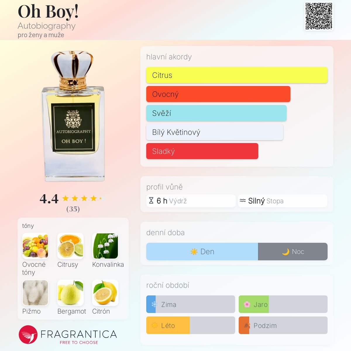 Oh Boy! podle Autobiography je Citrus Aromatic vůně pro ženy a muže. Oh Boy! byl/a uveden/a v roce 2020. Vrchní tóny jsou Citrusy, Bergamot a Citrón; střední tóny jsouOvoce, Konvalinka a Jasmín ; základní tóny jsou Pižmo, Jantar (ambra) a Pačuli.