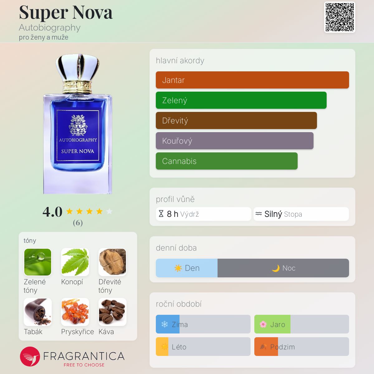 Super Nova podle Autobiography je Aromatic vůně pro ženy a muže. Super Nova byl/a uveden/a v roce 2020. Vrchní tóny jsou Zelené tóny a Konopí; střední tóny jsouDřevité tóny, Tabák, Pryskyřice a Káva ; základní tóny jsou Agarové dřevo (oud) a Kadidlo.