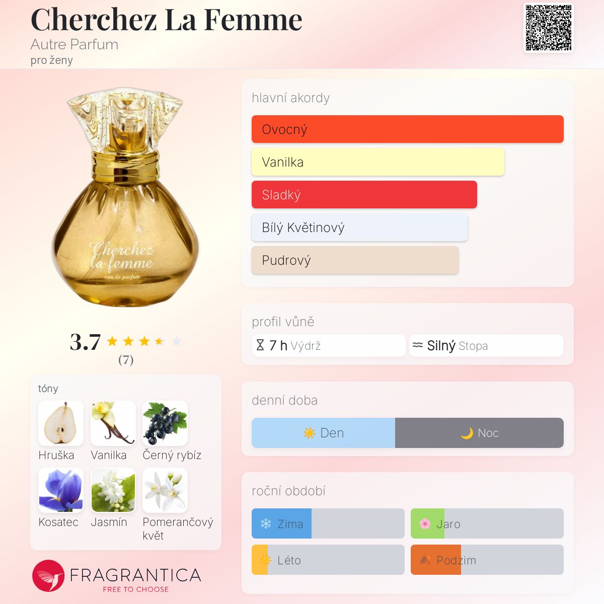 Cherchez La Femme podle Autre Parfum je Floral Fruity vůně pro ženy. Cherchez La Femme byl/a uveden/a v roce 2013. "Nosem" za touto vůní je Jean-Marc Henriot. Vrchní tóny jsou Hruška a Černý rybíz; střední tóny jsouKosatec, Jasmín a Pomerančový květ ; základní tóny jsou Vanilka a Pačuli.
