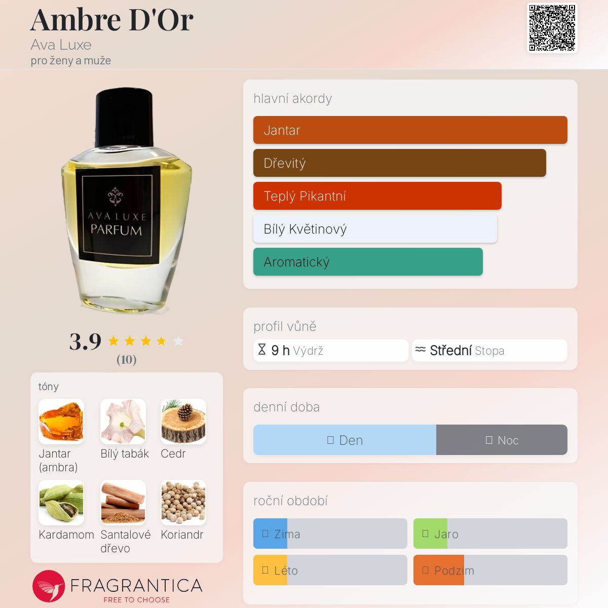 Ambre D'Or podle Ava Luxe je Orientální vůně pro ženy a muže. Ambre D'Or byl/a uveden/a v roce 2008. "Nosem" za touto vůní je Serena Ava Franco.