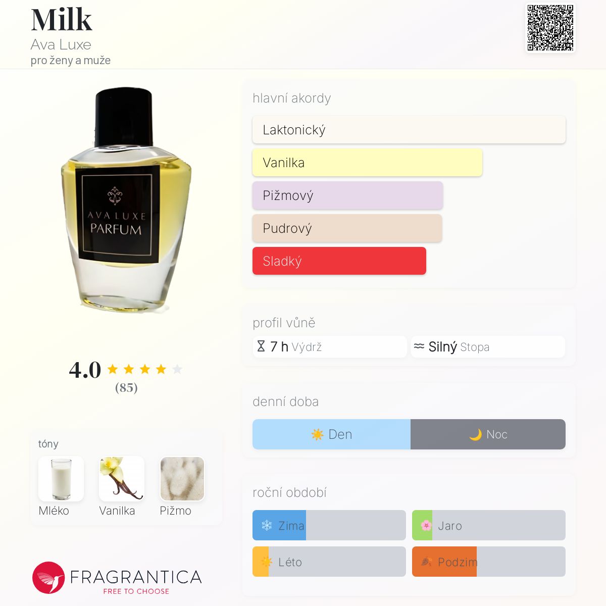 Milk podle Ava Luxe je Orientální Vanilla vůně pro ženy a muže. "Nosem" za touto vůní je Serena Ava Franco.
