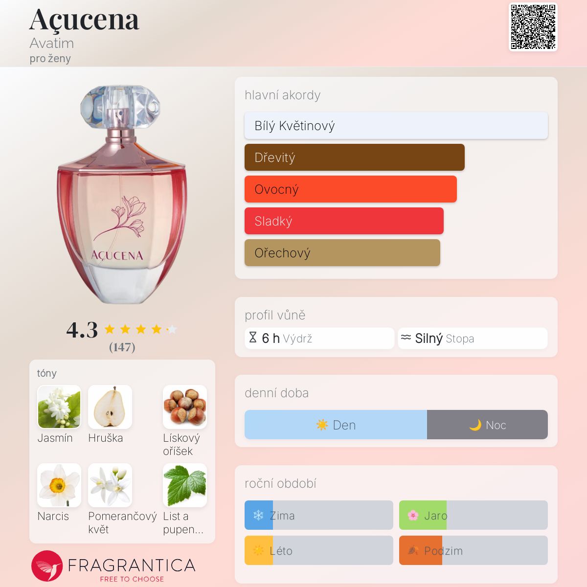 Açucena podle Avatim je Floral vůně pro ženy. Açucena byl/a uveden/a v roce 2020. "Nosem" za touto vůní je Alfredo Monteiro Filho. Vrchní tóny jsou Hruška a Černý rybíz; střední tóny jsouJasmín, Narcis a Pomerančový květ ; základní tóny jsou Lískový oříšek, Pižmo a Santalové dřevo.