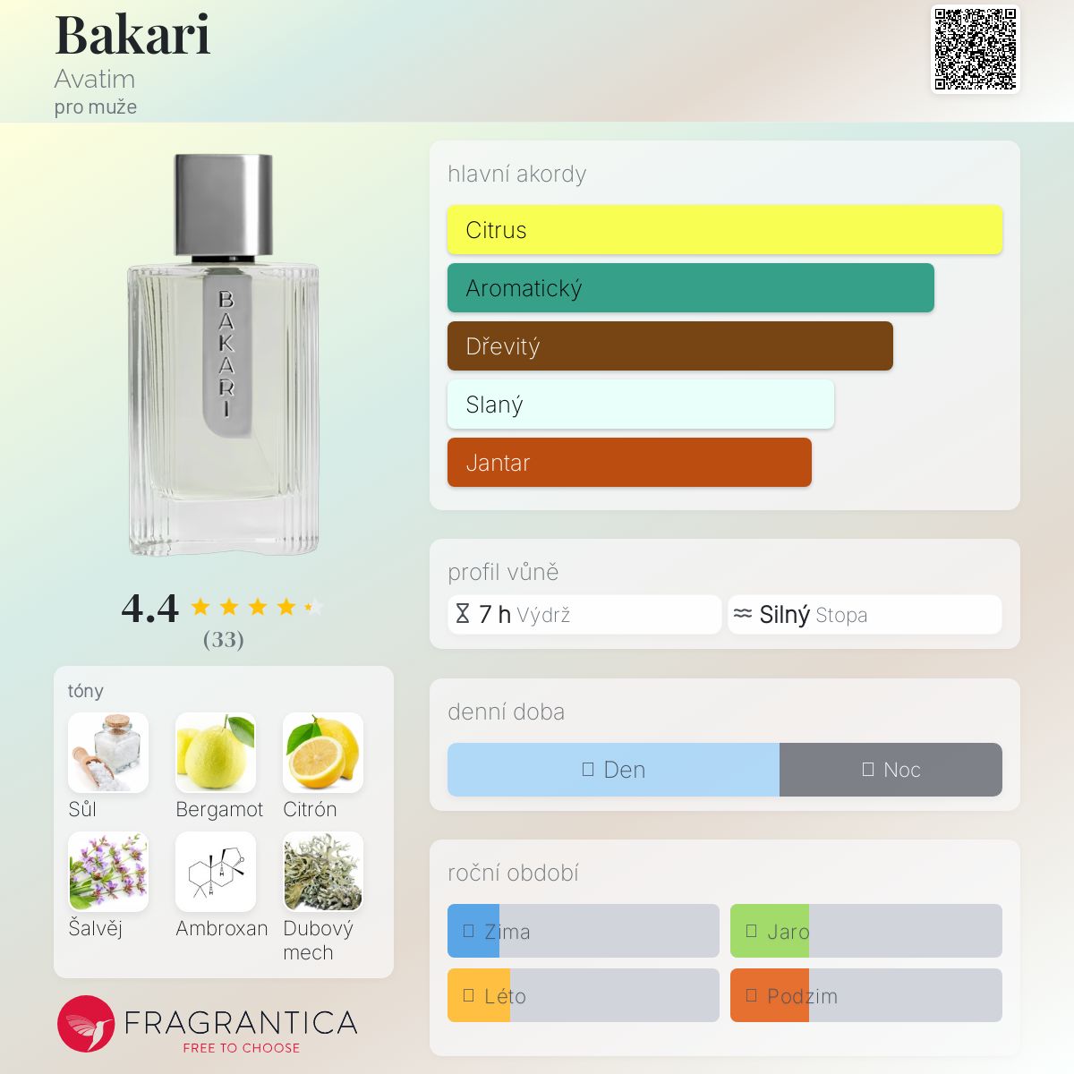 Bakari podle Avatim je Woody Aromatic vůně pro muže. Toto je nová vůně. Bakari byl/a uveden/a v roce 2025. Bakari byl/a vytvořen/a Edison Fujita a Luciana Bergamasco. Vrchní tóny jsou Bergamot, Šalvěj, Kardamom a Sicilský citron; střední tóny jsouKůže, Pačuli a Mořská sůl ; základní tóny jsou Cedr, Ambroxan, Dubový mech a Agarové dřevo (oud).