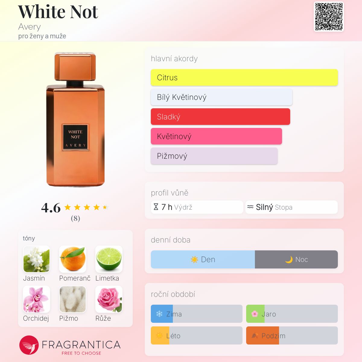 White Not podle Avery je Orientální Floral vůně pro ženy a muže. White Not byl/a uveden/a v roce 2018. "Nosem" za touto vůní je Celso Fadelli. Vrchní tóny jsou Pomeranč, Limetka a Bílý pepř; střední tóny jsouJasmín, Orchidej a Růže ; základní tóny jsou Bílé pižmo, Fazole tonka a Vanilka.