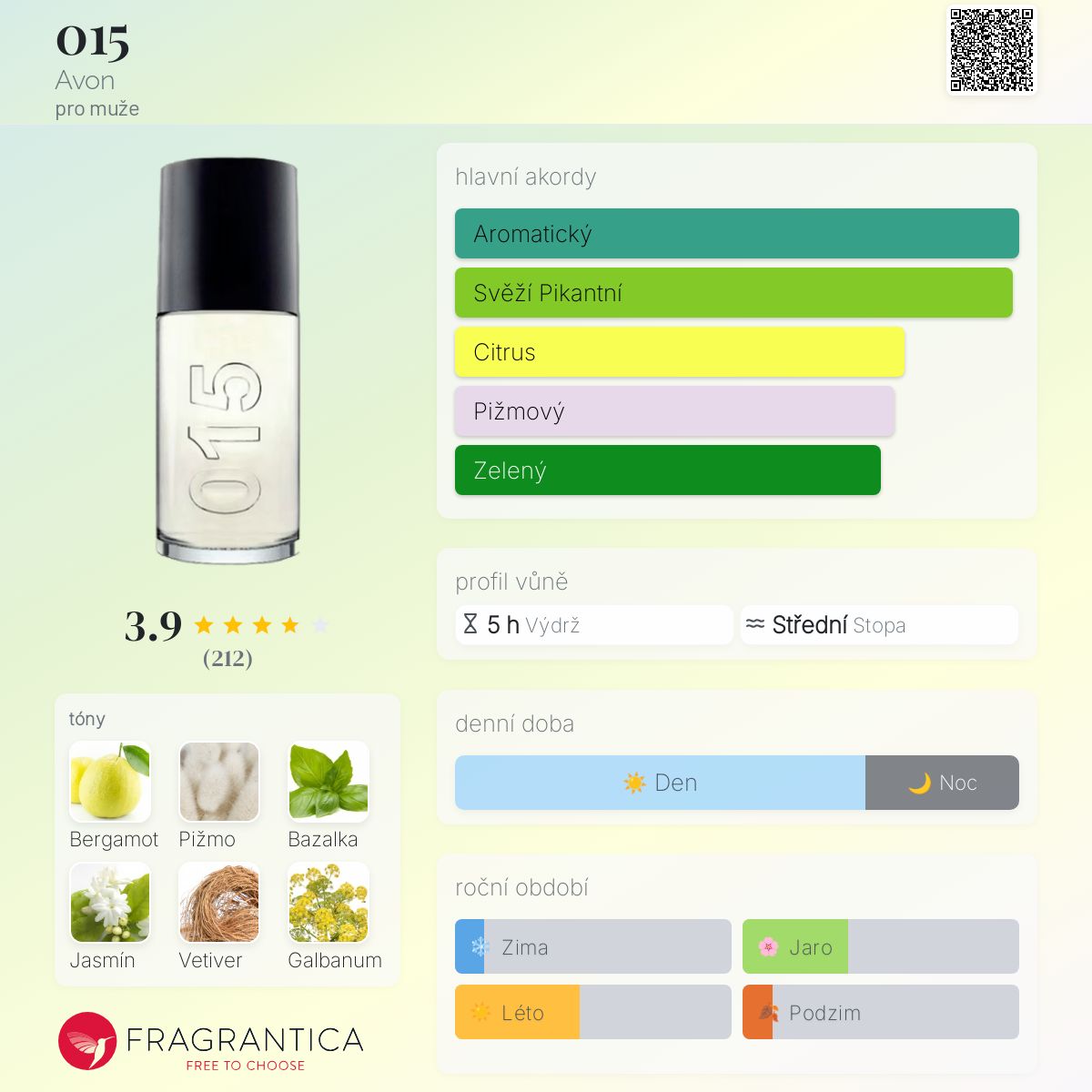 015 podle Avon je Woody Floral Musk vůně pro muže. Vrchní tóny jsou Bergamot, Galbanum a Levandule; střední tóny jsouBazalka, Jasmín, Pelargónie a Celer ; základní tóny jsou Pižmo, Vetiver, Santalové dřevo, Mech a Cedr.