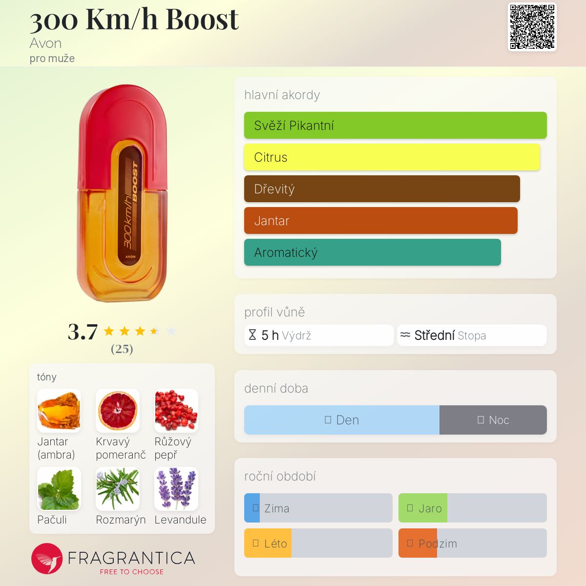 300 Km/h Boost podle Avon je Aromatic vůně pro muže. Toto je nová vůně. 300 Km/h Boost byl/a uveden/a v roce 2024. Vrchní tóny jsou Růžový pepř, Rozmarýn a Sečuánský pepř; střední tóny jsouKrvavý pomeranč a Levandule ; základní tóny jsou Jantar (ambra), Pačuli a Cedr.
