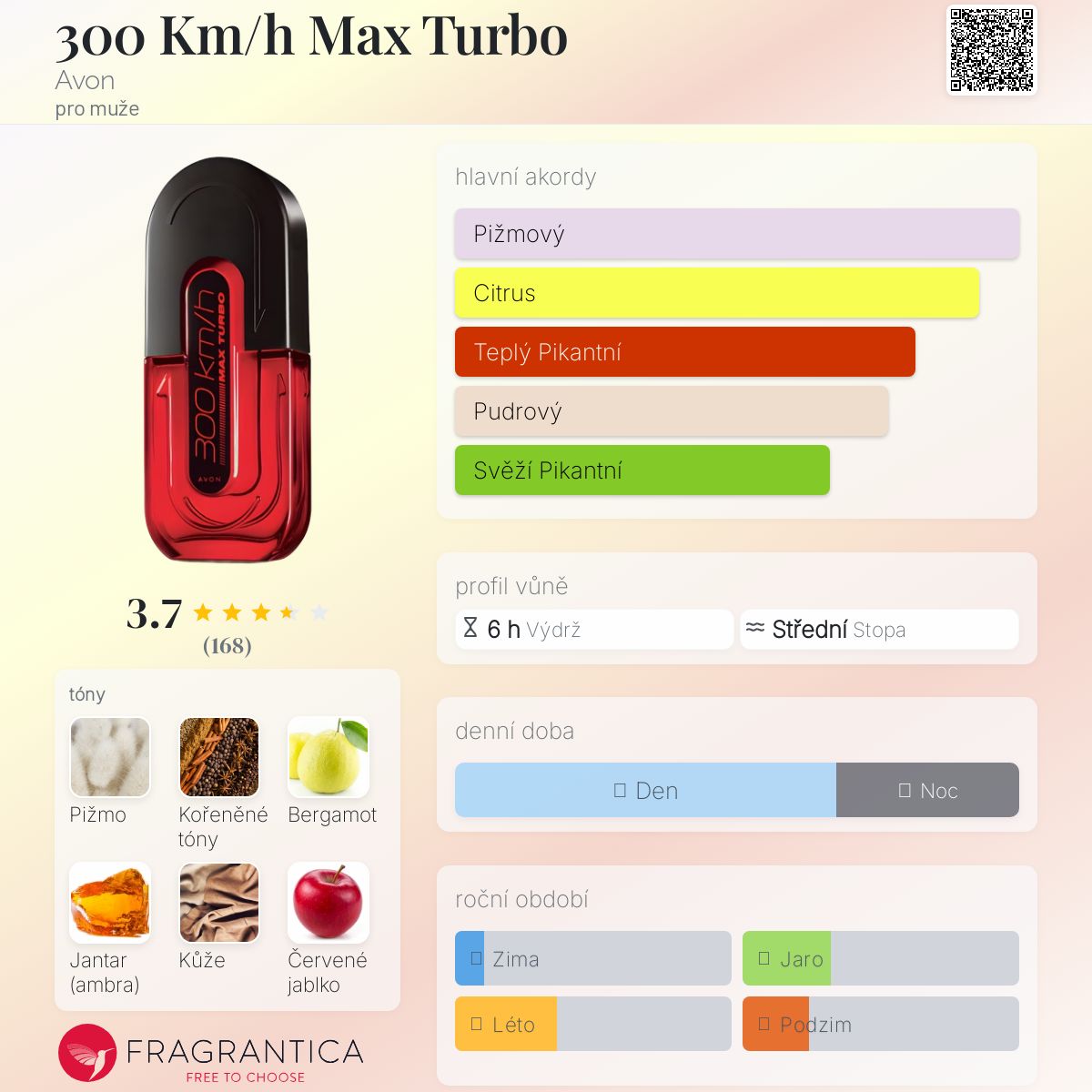 300 Km/h Max Turbo podle Avon je Citrus Aromatic vůně pro muže. 300 Km/h Max Turbo byl/a uveden/a v roce 2016. 300 Km/h Max Turbo byl/a vytvořen/a Clement Gavarry a Rafael Marano.