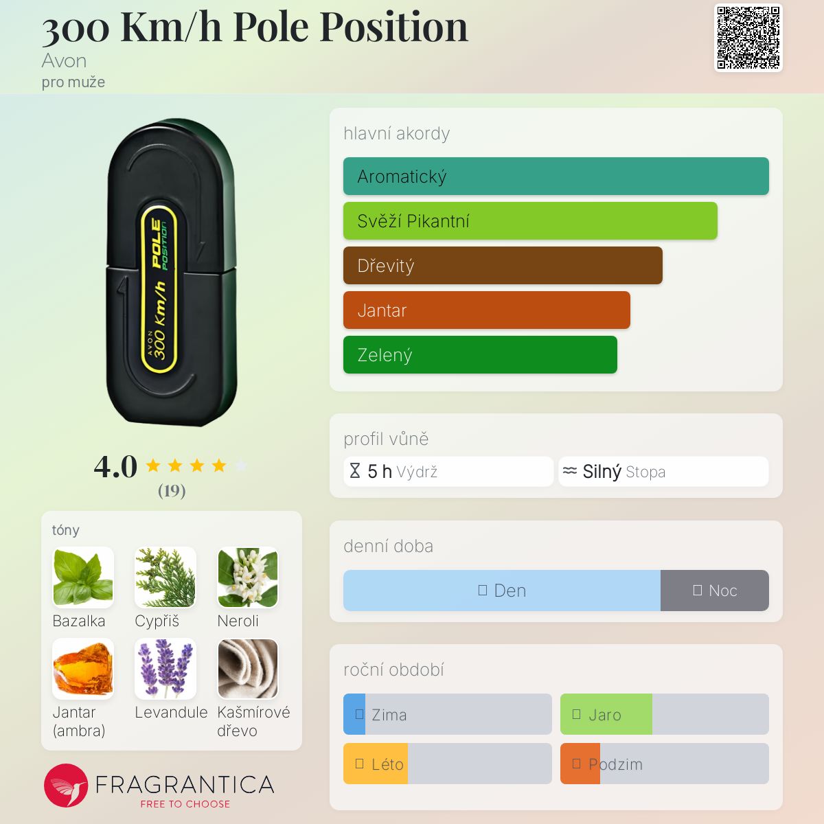 300 Km/h Pole Position podle Avon je Woody Aromatic vůně pro muže. 300 Km/h Pole Position byl/a uveden/a v roce 2014. "Nosem" za touto vůní je Frank Voelkl. Vrchní tóny jsou Bazalka, Šalvěj muškátová a Meloun; střední tóny jsouCypřiš, Neroli a Levandule ; základní tóny jsou Jantar (ambra), Kašmírové dřevo a Pižmo.