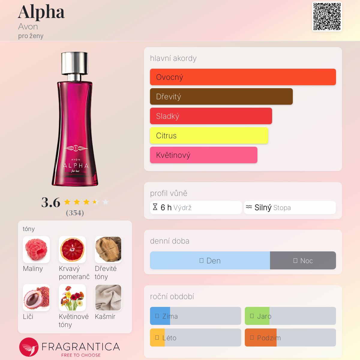 Alpha podle Avon je Floral Fruity vůně pro ženy. Alpha byl/a uveden/a v roce 2015. Alpha byl/a vytvořen/a Frank Vöelkl a Adilson Rato. Vrchní tóny jsou Maliny, Krvavý pomeranč a Liči; střední tóny jsouKvětinové tóny a Zimolez ; základní tóny jsou Dřevité tóny a Kašmír.