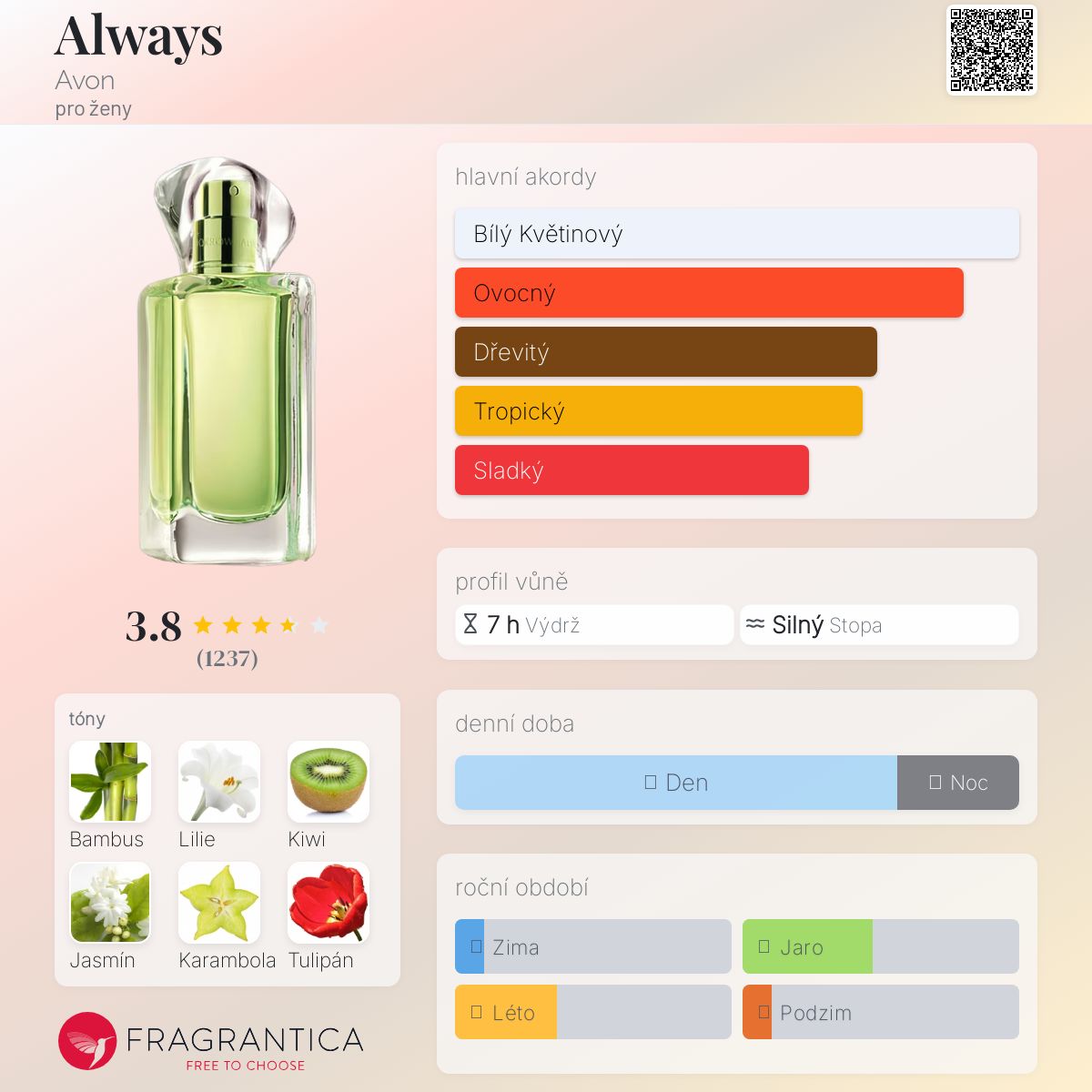 Always podle Avon je Floral Fruity vůně pro ženy. Always byl/a uveden/a v roce 2005. "Nosem" za touto vůní je Olivier Cresp. Vrchní tóny jsou Kiwi, Jasmín a Karambola; střední tóny jsouLilie, Tulipán, Slaměnka a Červený mák ; základní tóny jsou Bambus, Pižmo a Dřevité tóny. Tento parfém je vítězem oceněníFiFi Award Fragrance Of The Year Women`s Private Label 2005 .