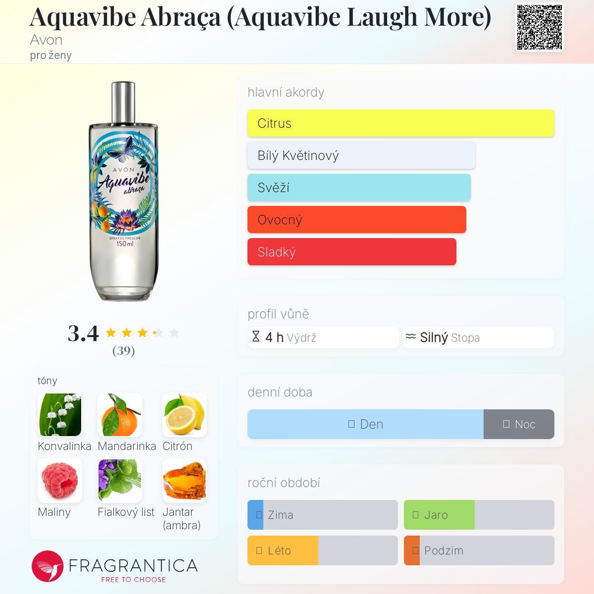 Aquavibe Abraça (Aquavibe Laugh More) podle Avon je Floral Fruity vůně pro ženy. Aquavibe Abraça (Aquavibe Laugh More) byl/a uveden/a v roce 2017. Vrchní tóny jsou Mandarinka, Citrón a Fenykl; střední tóny jsouKonvalinka, Maliny a Fialkový list ; základní tóny jsou Jantar (ambra), Pižmo a Fazole tonka.