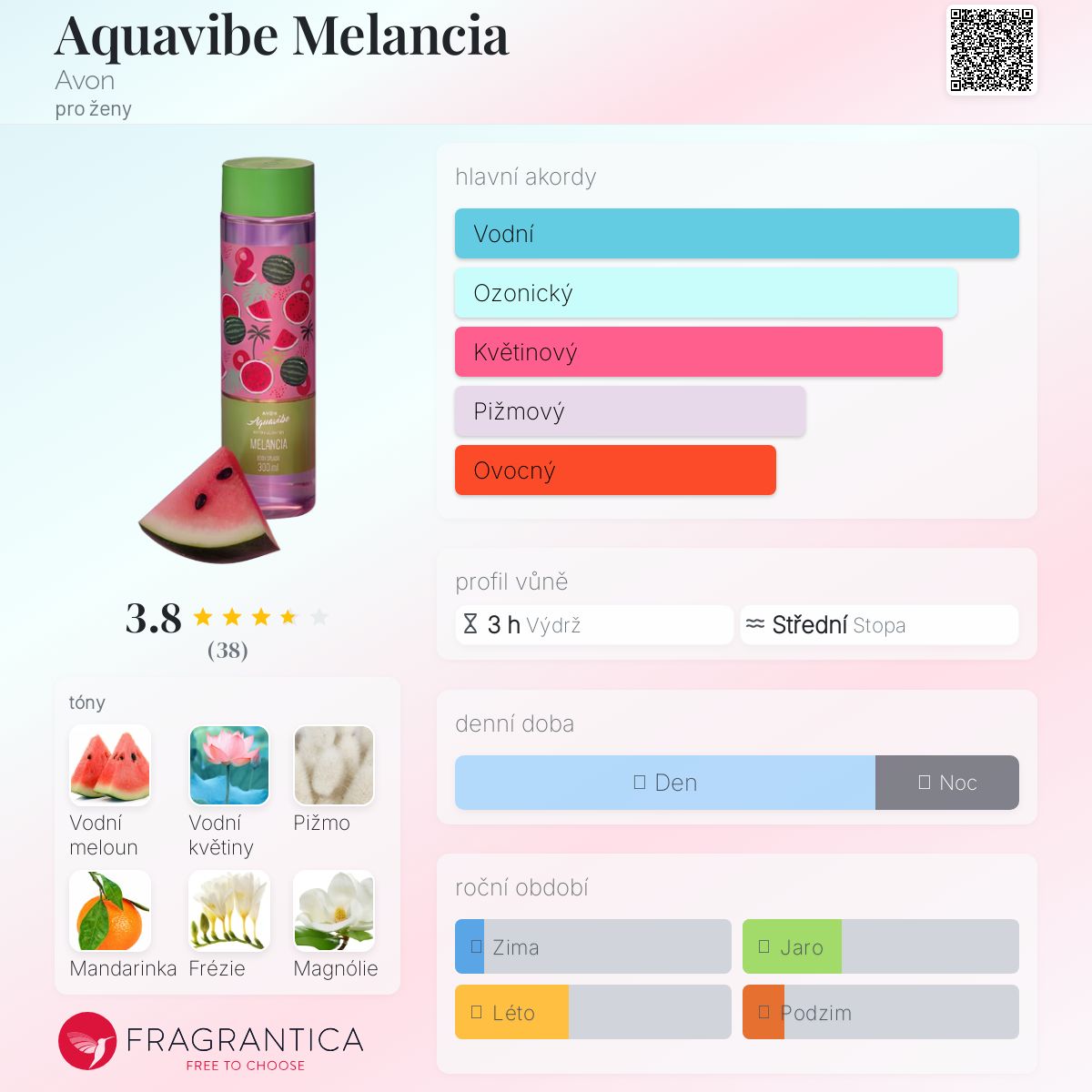 Aquavibe Melancia podle Avon je Aromatic Fruity vůně pro ženy. Aquavibe Melancia byl/a uveden/a v roce 2023. Vrchní tóny jsou Vodní meloun, Italská mandarinka a Ananas; střední tóny jsouVodní květiny, Frézie a Magnólie ; základní tóny jsou Bílé pižmo, Cedr a Vanilka.