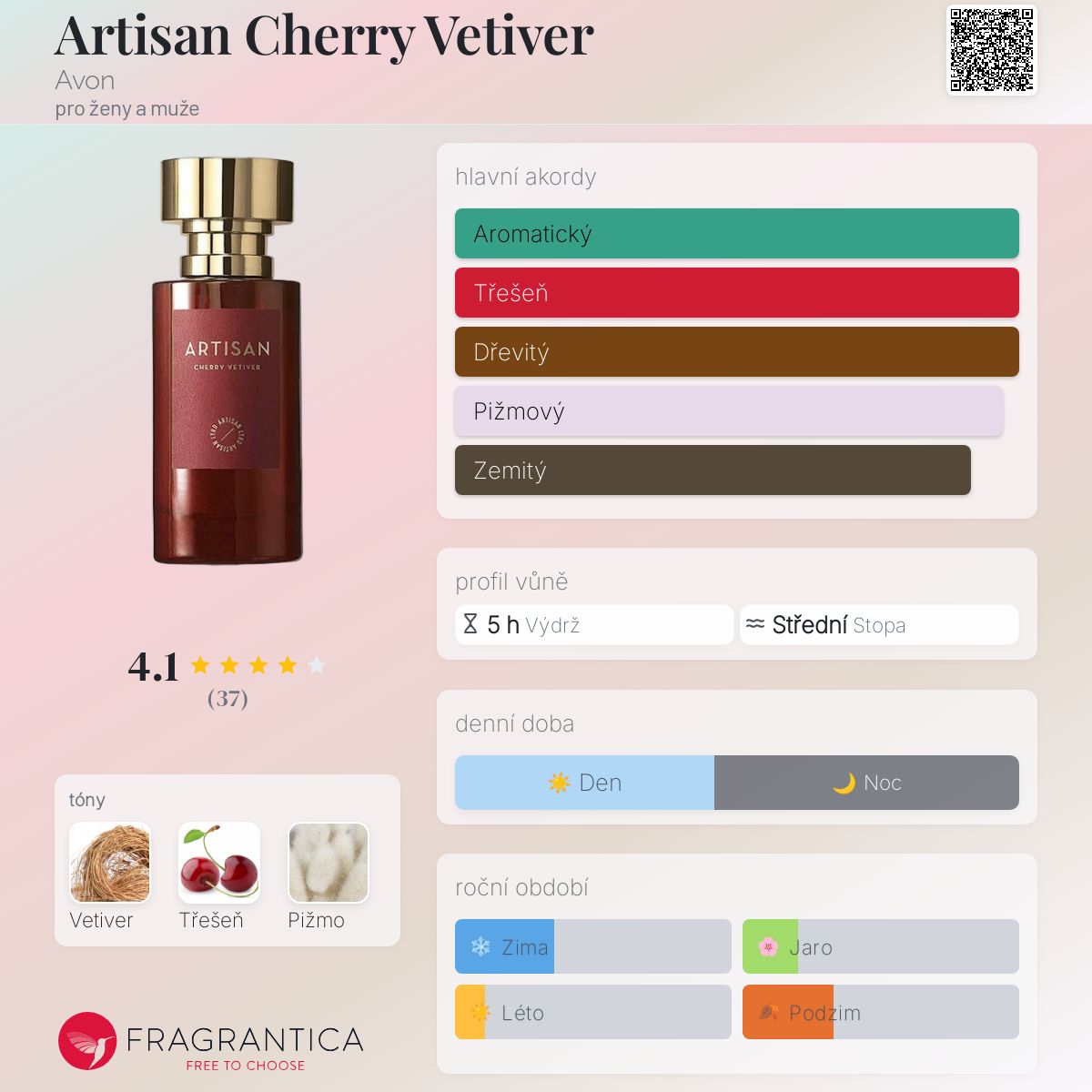 Artisan Cherry Vetiver podle Avon je Aromatic Fruity vůně pro ženy a muže. Artisan Cherry Vetiver byl/a uveden/a v roce 2020. Vrchní tón je Třešeň ; střední tón jeHaitský vetiver ; základní tón je Pižmo.
