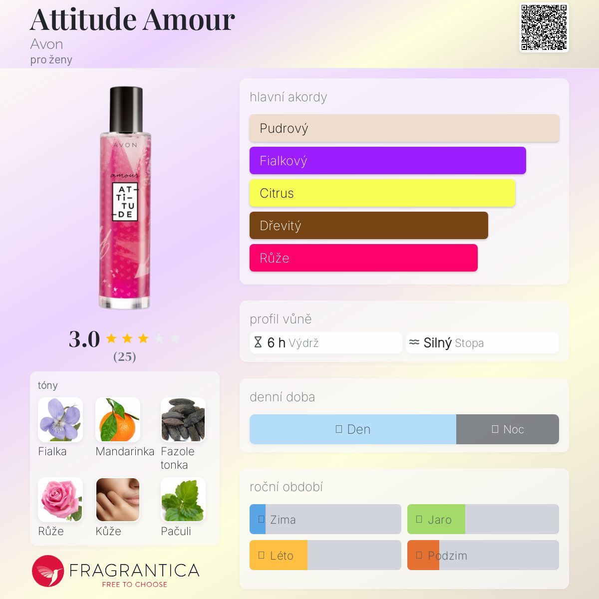 Attitude Amour podle Avon je vůně pro ženy. Attitude Amour byl/a uveden/a v roce 2020. Vrchní tóny jsou Fialka, Mandarinka a Pomerančový list; střední tóny jsouOkvětní lístky růží, Kůže, Broskev a Konvalinka ; základní tóny jsou Fazole tonka, Pačuli, Pižmo a Santalové dřevo.