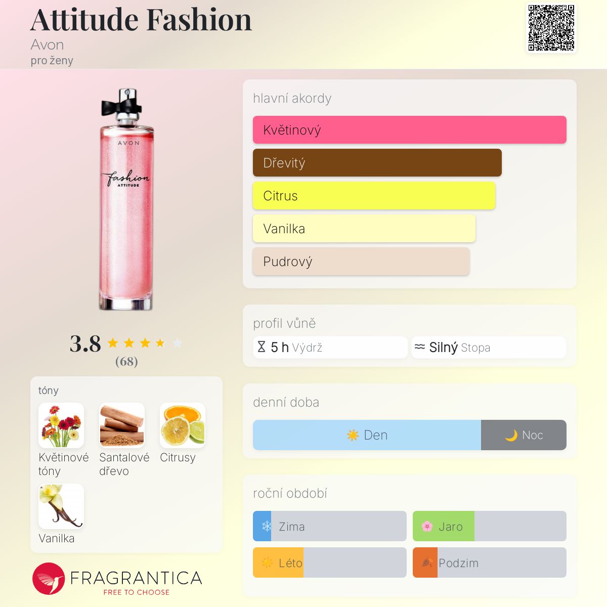 Attitude Fashion podle Avon je Orientální Floral vůně pro ženy. Attitude Fashion byl/a uveden/a v roce 2016. Vrchní tón je Citrusy ; střední tón jeKvětinové tóny ; základní tóny jsou Santalové dřevo a Vanilka.