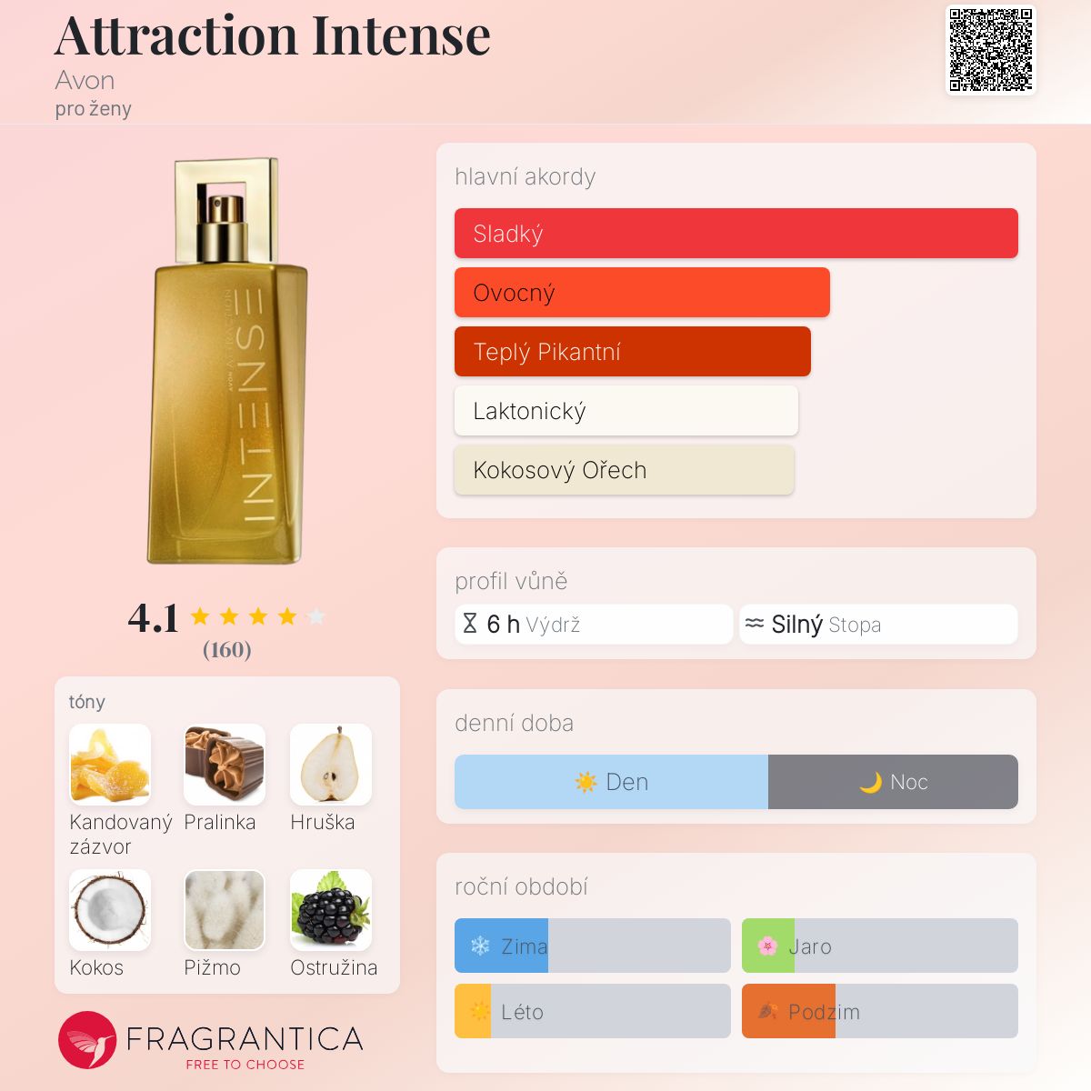 Attraction Intense podle Avon je vůně pro ženy. Attraction Intense byl/a uveden/a v roce 2022. "Nosem" za touto vůní je Honorine Blanc. Vrchní tóny jsou Kandovaný zázvor, Hruška a Ostružina; střední tóny jsouPižmo, Gardénie a Černá orchidej ; základní tóny jsou Pralinka, Kokos a Styrax.
