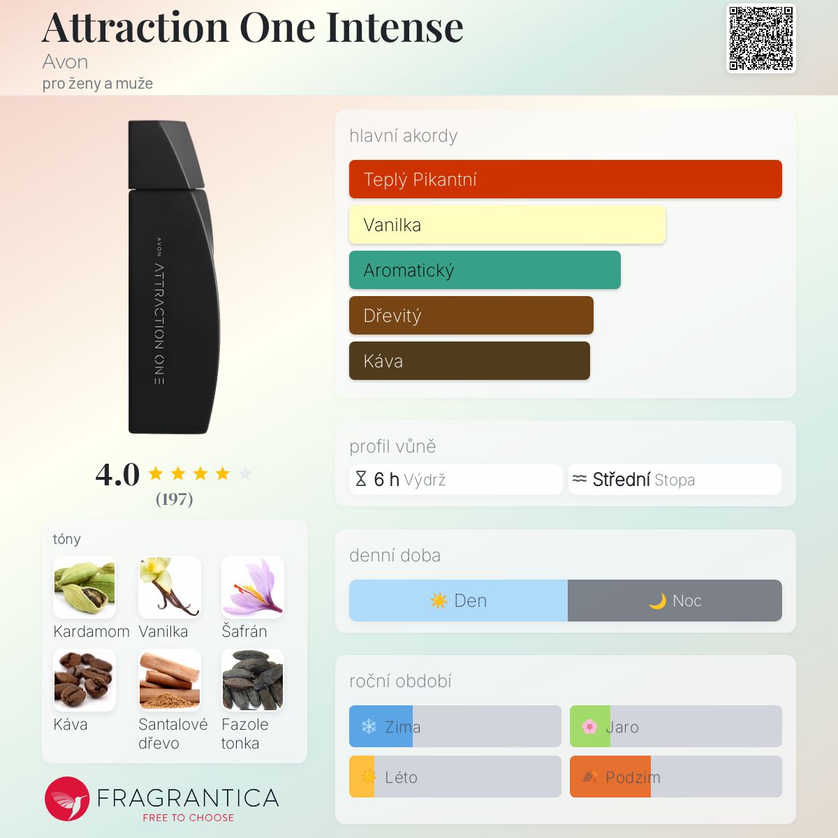 Attraction One Intense podle Avon je Orientální Woody vůně pro ženy a muže. Attraction One Intense byl/a uveden/a v roce 2020. "Nosem" za touto vůní je Frank Voelkl. Vrchní tóny jsou Kardamom, Bergamot, Růžový pepř a Vodnaté tóny; střední tóny jsouŠafrán, Káva a Citronový květ ; základní tóny jsou Vanilka, Santalové dřevo a Fazole tonka.
