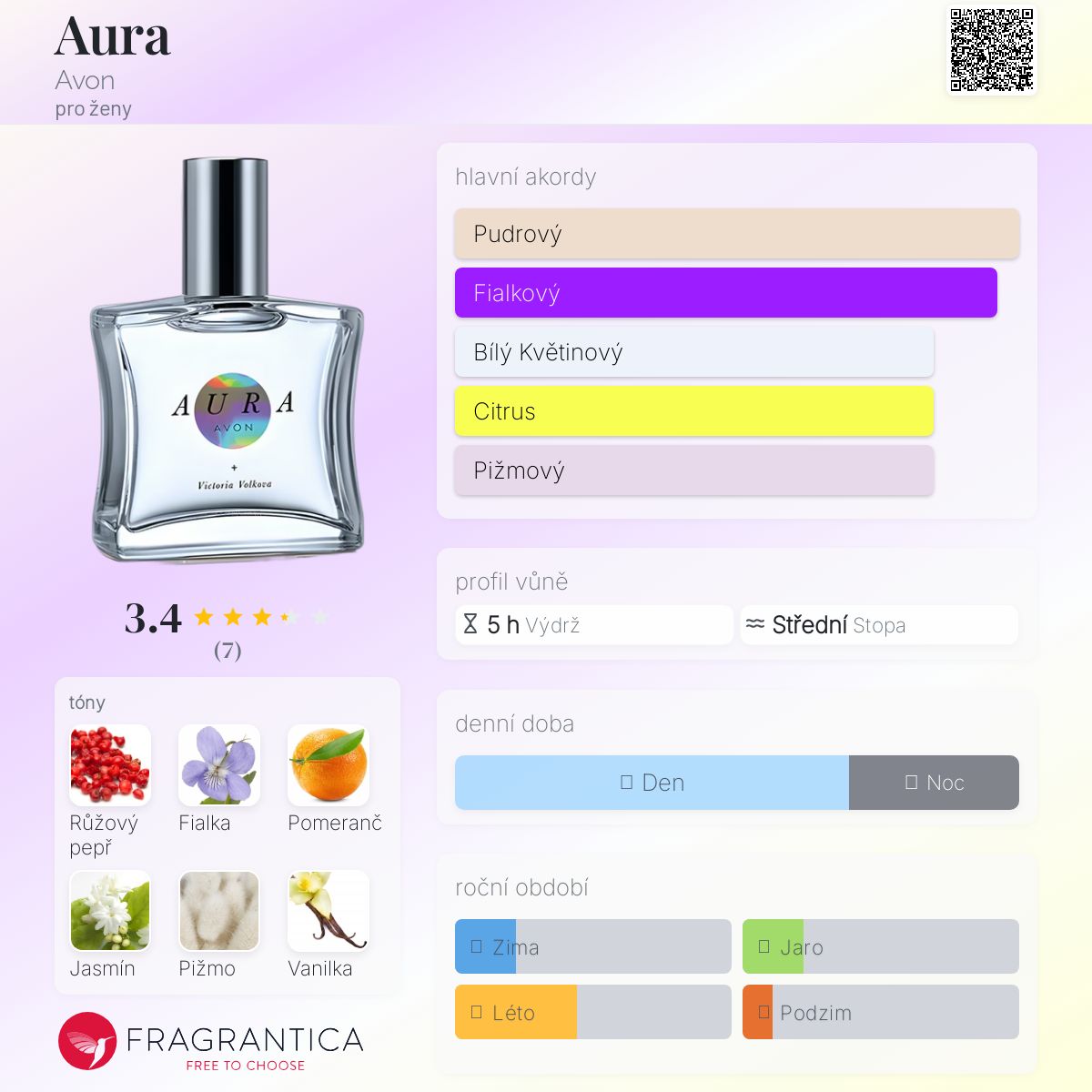 Aura podle Avon je Floral Fruity vůně pro ženy. Aura byl/a uveden/a v roce 2018. Vrchní tóny jsou Růžový pepř a Pomeranč; střední tóny jsouFialka a Jasmín ; základní tóny jsou Bílé pižmo a Vanilka.