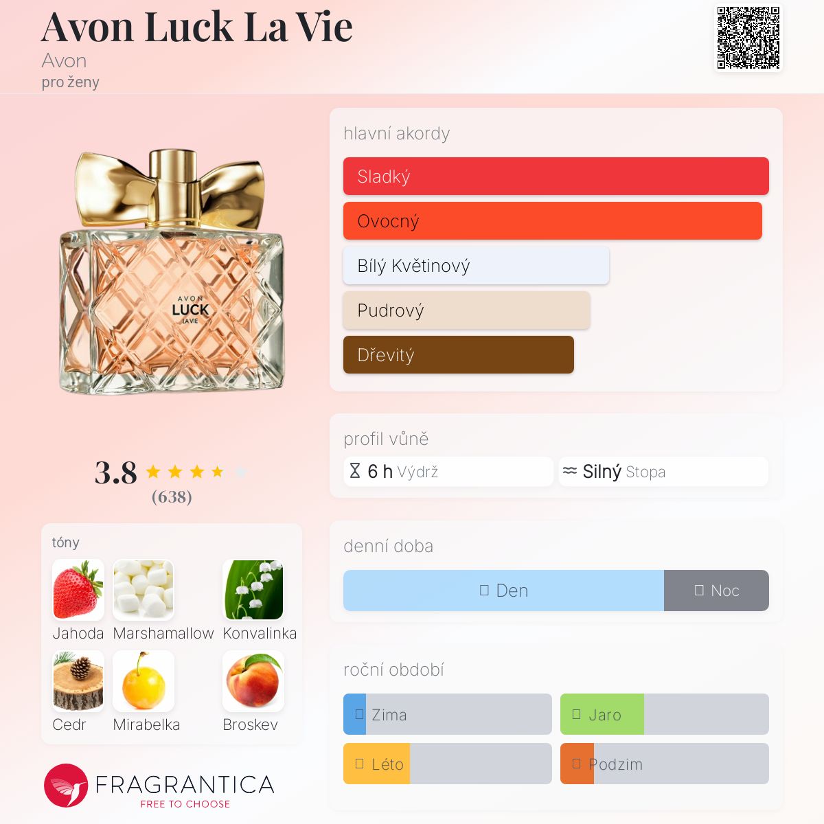 Avon Luck La Vie podle Avon je Floral Fruity vůně pro ženy. Avon Luck La Vie byl/a uveden/a v roce 2015. Vrchní tóny jsou Jahoda, Mirabelka a Mandarinka; střední tóny jsouKonvalinka, Lipový květ a Jasmín Sambac ; základní tóny jsou Marshamallow, Extrakt z bílého cedru a Broskev.