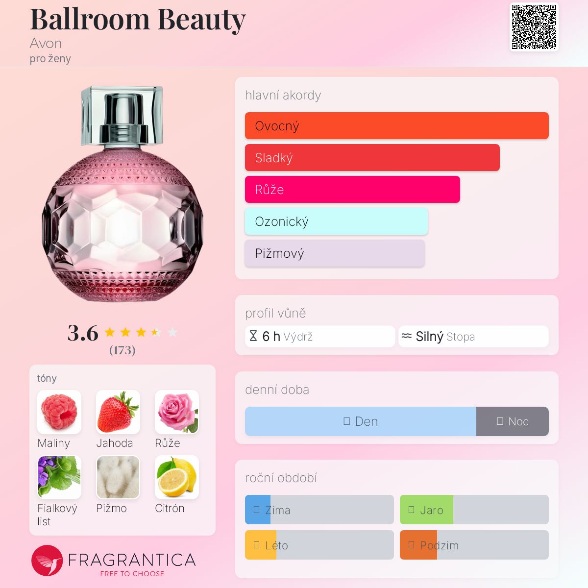 Ballroom Beauty podle Avon je Floral Fruity vůně pro ženy. Ballroom Beauty byl/a uveden/a v roce 2012. Vrchní tóny jsou Maliny, Jahoda a Citrón; střední tóny jsouRůže, Fialkový list a Jasmín ; základní tóny jsou Pižmo, Jantar (ambra) a Santalové dřevo.