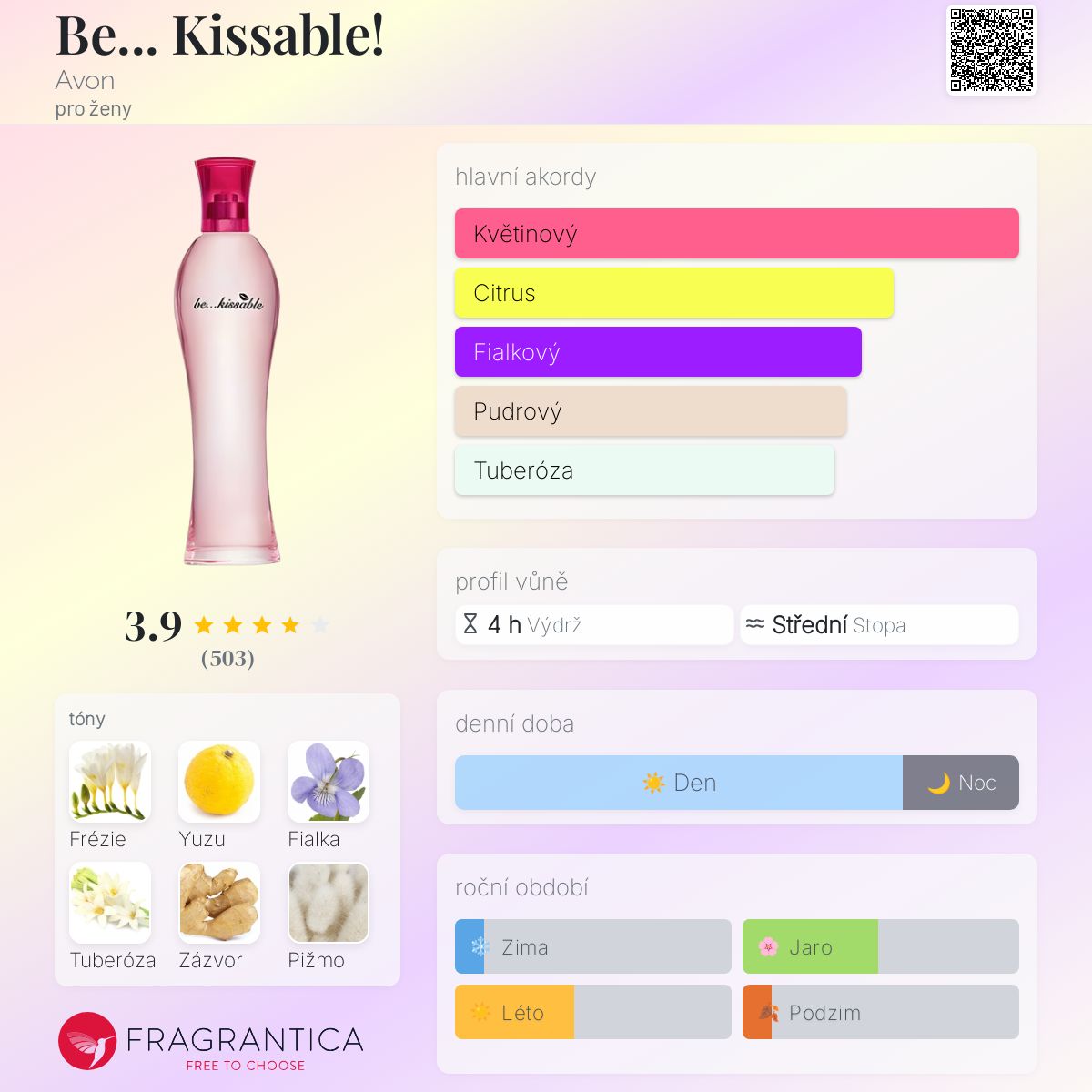 Be... Kissable! podle Avon je Floral Fruity vůně pro ženy. Vrchní tóny jsou Yuzu, Zázvor a Koriandr; střední tóny jsouFrézie, Fialka a Tuberóza ; základní tón je Pižmo.