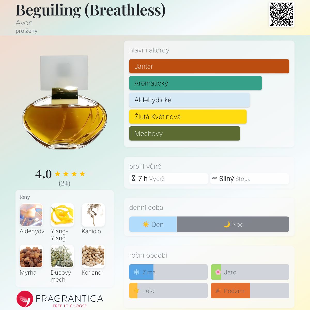 Beguiling (Breathless) podle Avon je vůně pro ženy. Beguiling (Breathless) byl/a uveden/a v roce 1987. Vrchní tóny jsou Aldehydy, Ylang-Ylang a Bergamot; střední tóny jsouKoriandr, Jasmín a Bazalka ; základní tóny jsou Kadidlo, Myrha a Dubový mech.