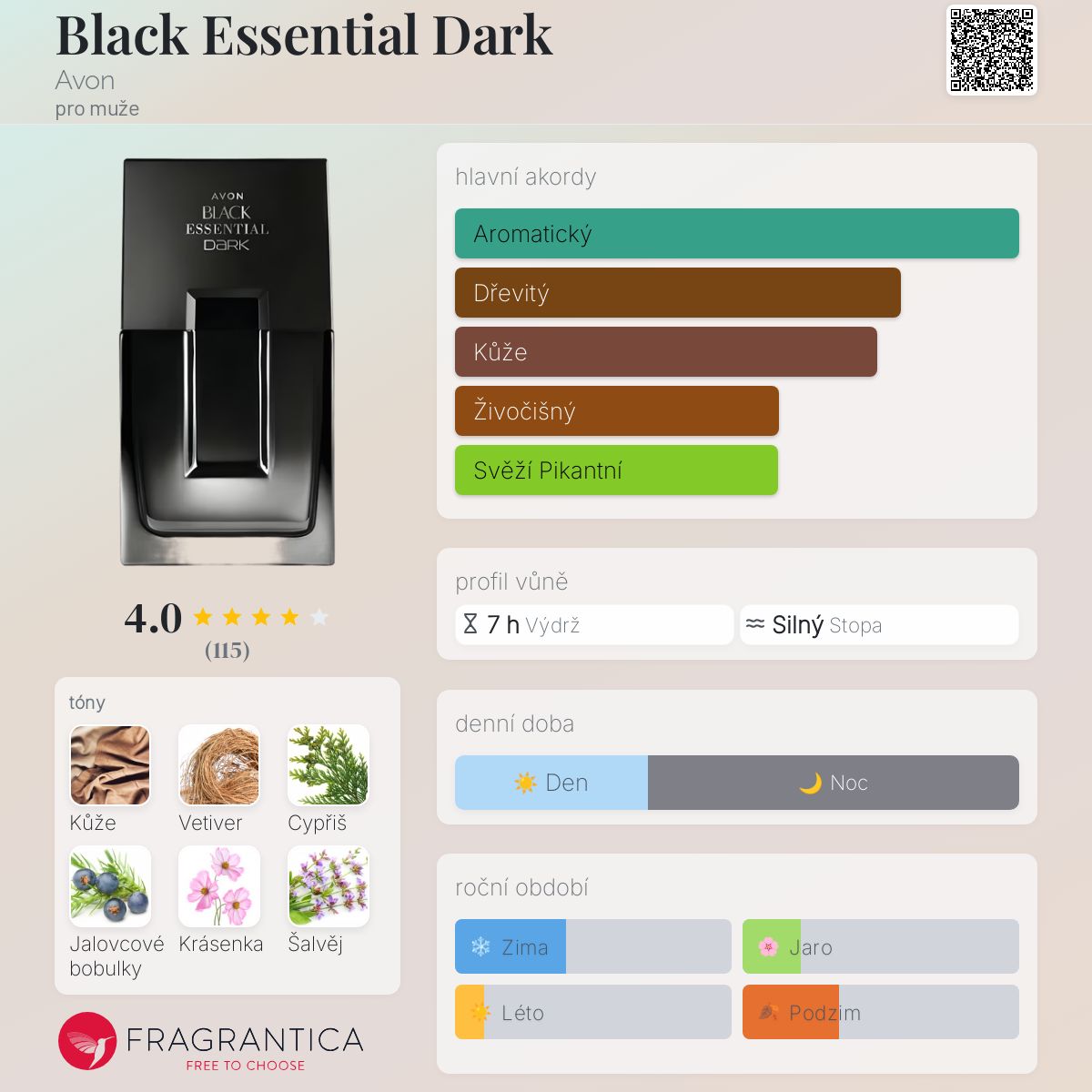 Black Essential Dark podle Avon je Leather vůně pro muže. Black Essential Dark byl/a uveden/a v roce 2020. "Nosem" za touto vůní je Mike Parrot. Vrchní tóny jsou Jalovcové bobulky, Krásenka a Kardamom; střední tóny jsouRuská kůže, Šalvěj a Oves ; základní tóny jsou Vetiver, Cypřiš a Vanilka.