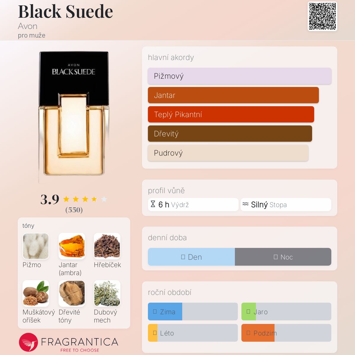 Black Suede podle Avon je Orientální vůně pro muže. Black Suede byl/a uveden/a v roce 1980. Vrchní tóny jsou Muškátový oříšek, Aldehydy, Karafiát, Zelené tóny, Koriandr a Bergamot; střední tóny jsouHřebíček, Kůže, Vetiver, Růže, Levandule, Orris, Otočník, Ylang-Ylang, Pelargónie, Tymián, Fialka a Kardamom ; základní tóny jsou Pižmo, Jantar (ambra), Dřevité tóny, Dubový mech, Cibetka, Opoponax, Semiš a Anýz.