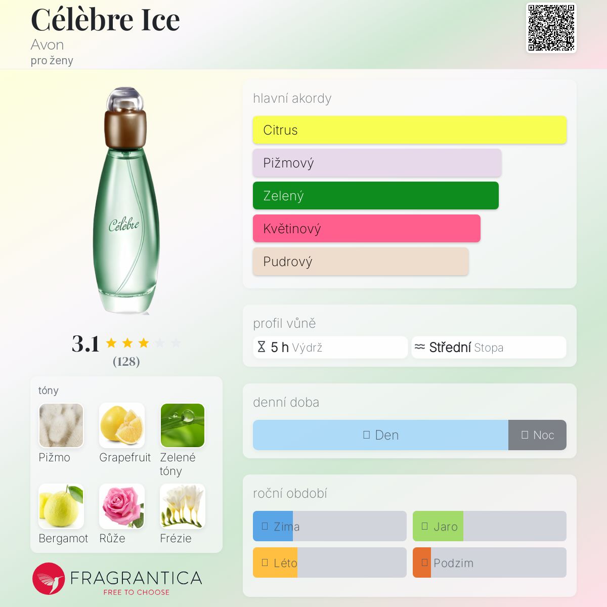 Célèbre Ice podle Avon je Floral Fruity vůně pro ženy. Célèbre Ice byl/a uveden/a v roce 2013. Vrchní tóny jsou Grapefruit, Zelené tóny, Bergamot a Fialkový list; střední tóny jsouRůže, Frézie a Broskev ; základní tóny jsou Pižmo, Dřevité tóny a Vanilka.