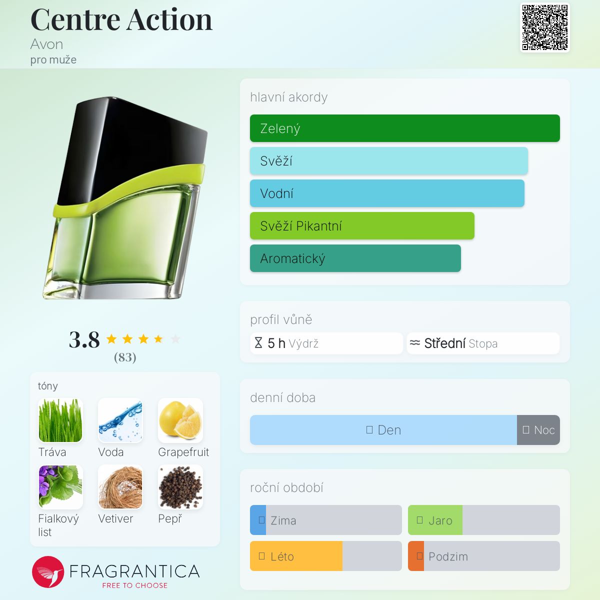 Centre Action podle Avon je Aromatic Fougere vůně pro muže. Centre Action byl/a uveden/a v roce 2012. Vrchní tóny jsou Tráva, Vodní tóny a Černý pepř; střední tóny jsouGrapefruit, Fialkový list a Levandule ; základní tóny jsou Vetiver, Dubový mech a Kůže.