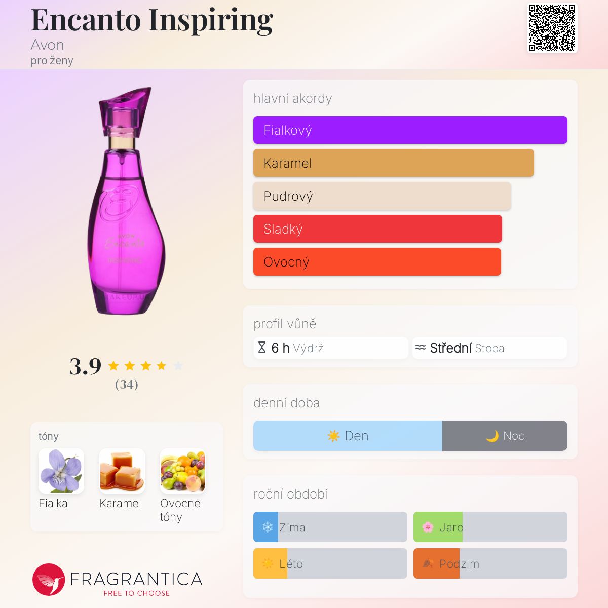 Encanto Inspiring podle Avon je vůně pro ženy. Encanto Inspiring byl/a uveden/a v roce 2021. Vrchní tón je Ovoce ; střední tón jeFialka ; základní tón je Karamel.