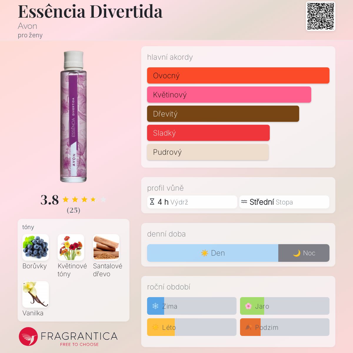 Essência Divertida podle Avon je Floral Fruity Gourmand vůně pro ženy. Essência Divertida byl/a uveden/a v roce 2016. Vrchní tón je Borůvky ; střední tón jeKvětinové tóny ; základní tóny jsou Santalové dřevo a Vanilka.