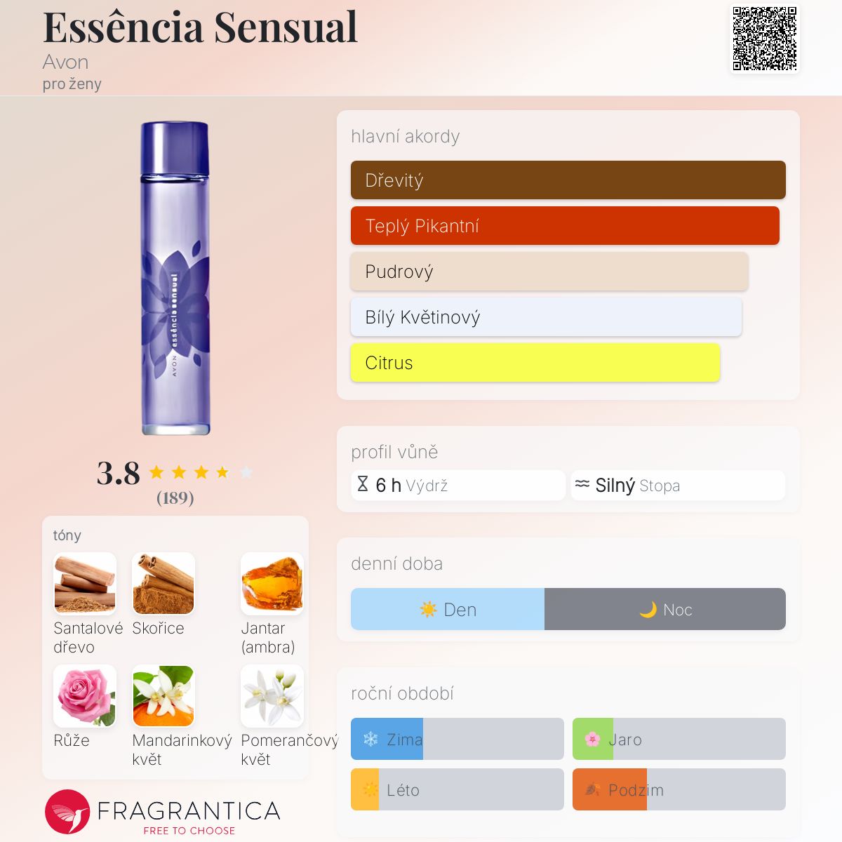 Essência Sensual podle Avon je Orientální vůně pro ženy. Essência Sensual byl/a uveden/a v roce 2011. Vrchní tóny jsou Mandarinkový květ, Broskev a Bergamot; střední tóny jsouSkořice, Růže a Pomerančový květ ; základní tóny jsou Santalové dřevo, Jantar (ambra) a Pižmo.