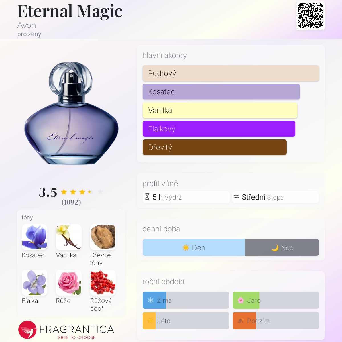 Eternal Magic podle Avon je Floral vůně pro ženy. Eternal Magic byl/a uveden/a v roce 2010. "Nosem" za touto vůní je Ellen Molner. Vrchní tóny jsou Fialka, Růžový pepř a Bergamot; střední tóny jsouKosatec, Růže a Magnólie ; základní tóny jsou Vanilka a Dřevité tóny.